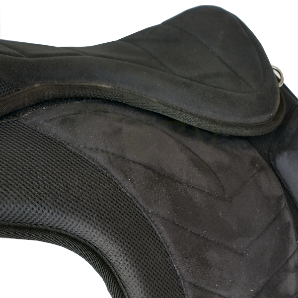 The saddle is made from a one-piece foam base and a one-piece foam seat attached with strong velcro. Between the base and the seat you find the secure closed stirrup attachment and the wither iron. Both are adjustable and removable. It has fixed knee rolls in the front, and two ring in front and three rings on the back, for attaching saddlebags, breastplate, saddle pad etc. The top is made from black suede fabric, and the underside is black fleece. The saddle is very light and weigh about 3 kg.
